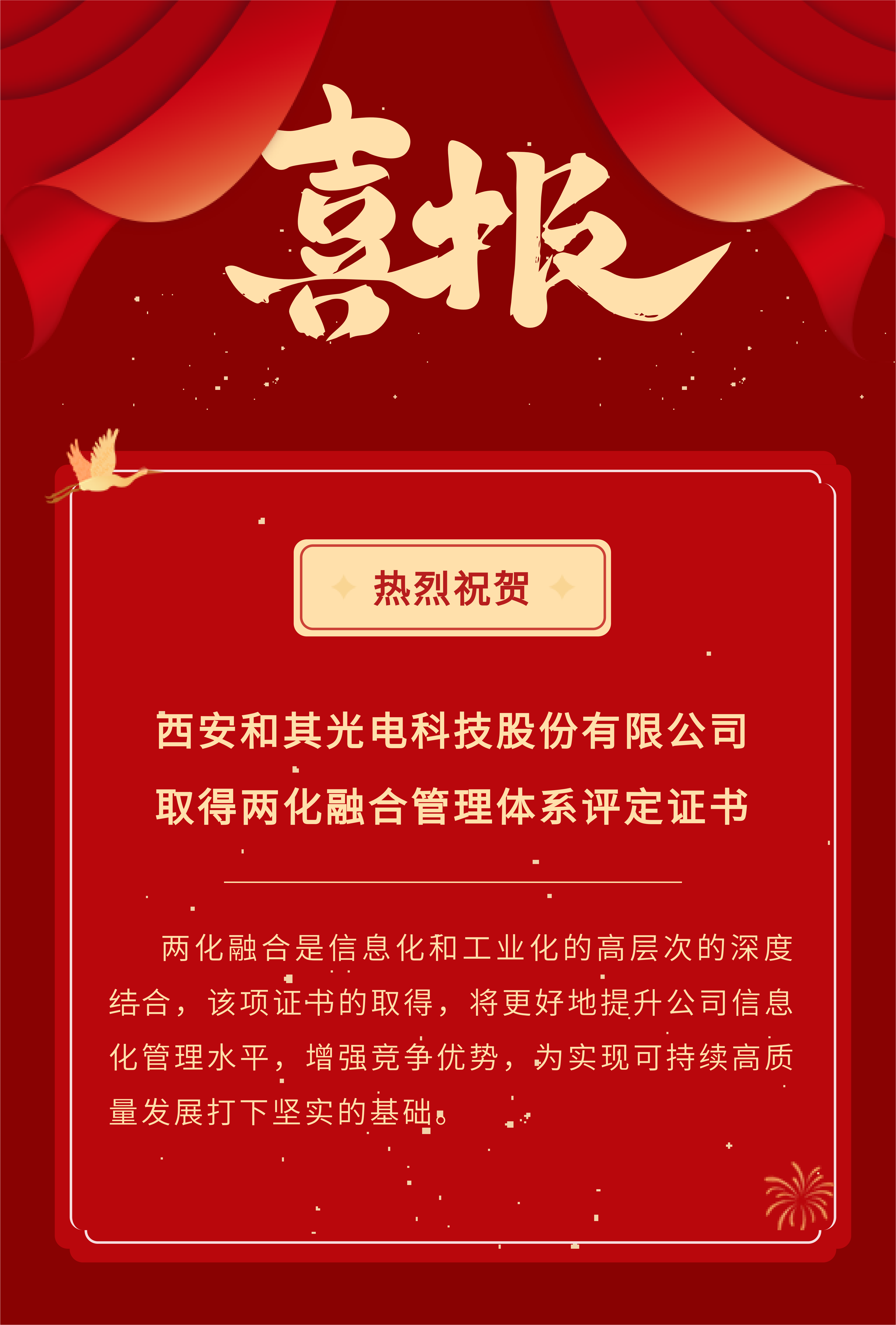 熱烈祝賀西安和其光電科技股份有限公司取得兩化融合管理體系評定證書